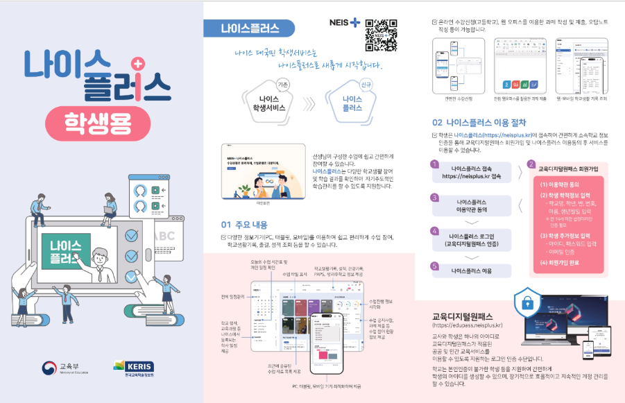 나이스플러스는 교육부가 제공하는 공식 학사 관리 시스템입니다. 이 시스템을 통해 학생들은 성적, 출결, 반배정, 학교생활기록부를 조회할 수 있고, 학부모는 자녀의 학업 정보 및 생활 기록을 확인할 수 있습니다.