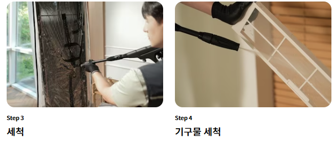 - 분해 및 고압세척: 내부 열교환기와 부품을 분해하고 고압세척기로 먼지와 오염물질을 제거합니다.