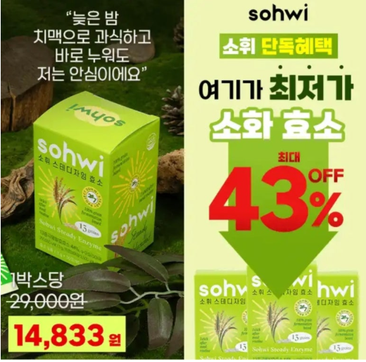 또 더부룩하세요? 지금 무첨가 소휘효소로 바꿔보세요! 식후 1포면 기분나쁜 팽만감 리셋! 🚨2+1 최대혜택 외국보다 3배 이상 탄수화물 섭취가 많은 식습관을 가진 한국인들에게 필수템이 된 소휘 소화효소는 호불호 없이 누구나 맛있게 먹을 수 있는 고소한 곡물맛으로 100%통곡물 저분자 OO 효소입니다! 단 1포로 속편한 하루 보내세요! 여기서 OO은?