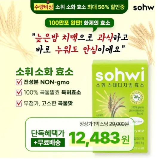 밥,빵,면 무작정 끊지 말고! 소화 못시킨 탄수화물은 소휘 효소로 싹 내려보내세요! 🚨지금 이 링크를 벗어나면 혜택은 없어요 효소는 생명체가 유지하는 필수 성분으로, 우리 몸속에서 한정된 양으로 생성되지만 OO가 들수록 그 양은 점점 줄어들어 꼭 외부 섭취 해주어야 합니다. 재구매 많은 소휘 효소 1포로 더부룩함은 싹 날려버리세요. 여기서 OO은?