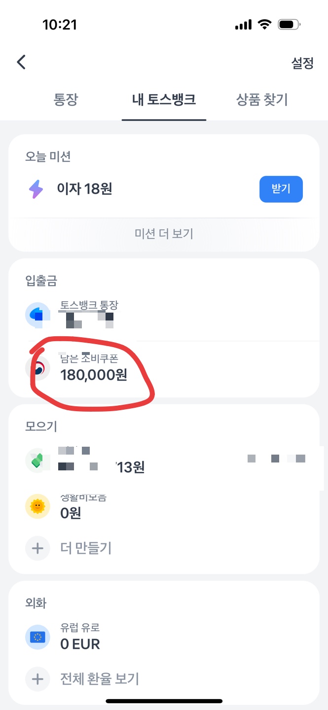 - [전체] → [토스뱅크] → 남은 소비쿠폰 클릭