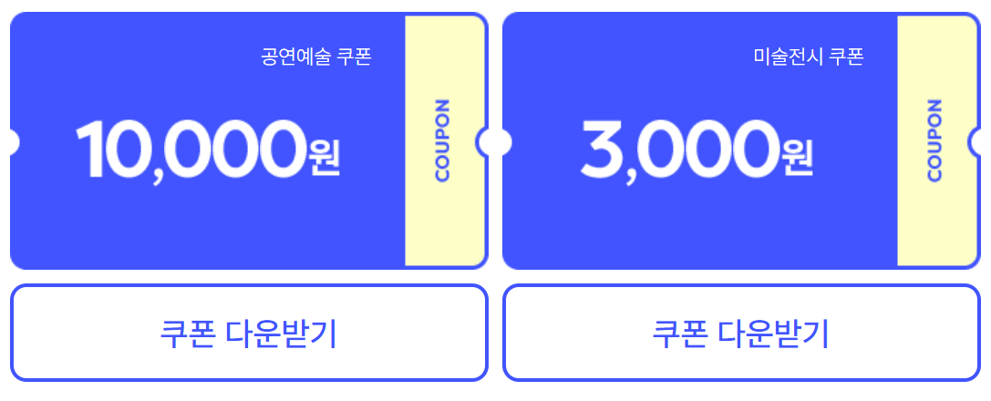 - 공연 또는 전시 예매 시 쿠폰 선택(1회 결제 1매, 예매처별 2매씩 사용 가능)