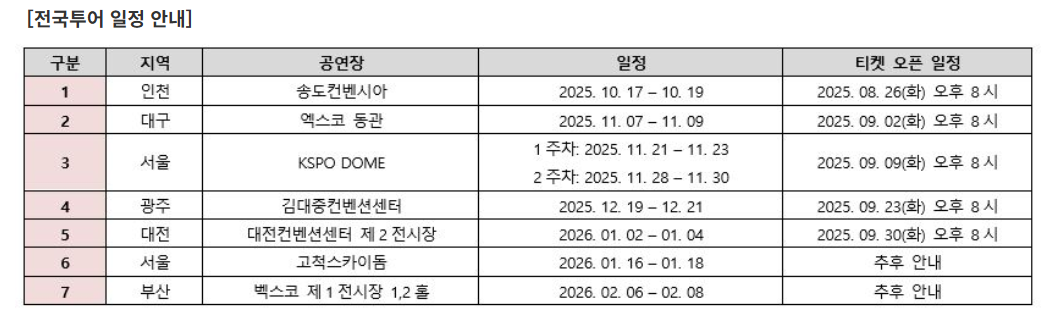 - 대구 공연: 2025년 11월 7일부터 9일까지, 대구 엑스코 동관