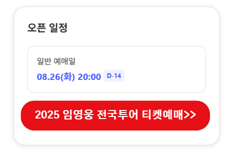 임영웅의 2025 전국투어 콘서트 티켓은 인터파크티켓을 통해 예매할 수 있습니다. 예매는 2025년 8월 26일 화요일 오후 8시에 인천 지역 티켓 오픈을 시작으로, 이후 대구, 서울, 광주, 대전 등 지역별로 1~2주 간격으로 진행됩니다. 아래 티켓 오픈 일정을 확인하세요