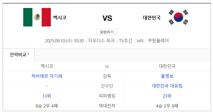 한국은 현재 FIFA 랭킹 23위로, 멕시코와의 맞대결에서 최근 3연패를 기록 중입니다. 이번 경기에서 연패 탈출이 가능할지 주목됩니다.