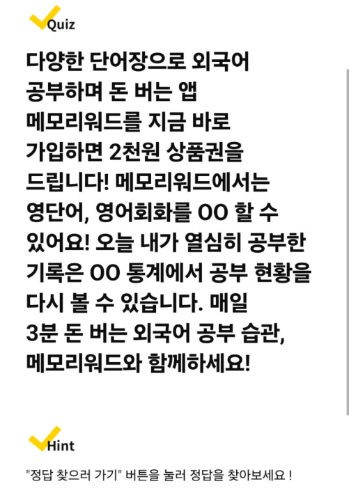 다양한 단어장으로 외국어 공부하며 돈 버는 앱 메모리워드를 지금 바로 가입하면 2천원 상품권을 드립니다! 메모리워드에서는 영단어, 영어회화를 OO 할 수 있어요! 오늘 내가 열심히 공부한 기록은 OO 통계에서 공부 현황을 다시 볼 수 있습니다. 매일 3분 돈 버는 외국어 공부 습관, 메모리워드와 함께하세요!