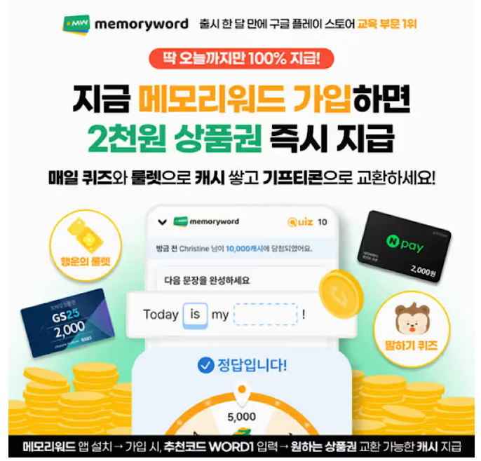 매일 외국어 공부하며 돈 버는 앱 메모리워드를 오늘 바로 가입하면 2천원 상품권을 즉시 지급해드려요! 메모리워드에서는 예문 OO, 말하기 OO, 행운의 룰렛 등 다양한 방법으로 캐시를 적립할 수 있어요! 적립한 캐시는 기프티콘으로 바로 교환할 수 있어요. 지금 바로 영어 공부 습관도 만들고, 돈 버는 재미도 경험하세요!