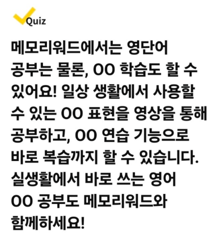 메모리워드에서는 영단어 공부는 물론, OO 학습도 할 수 있어요! 일상 생활에서 사용할 수 있는 OO 표현을 영상을 통해 공부하고, OO 연습 기능으로 바로 복습까지 할 수 있습니다. 실생활에서 바로 쓰는 영어 OO 공부도 메모리워드와 함께하세요!