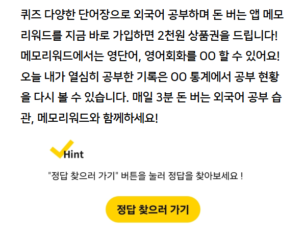 매일 3분 외국어 공부하며 돈 버는 앱 메모리워드에서는 퀴즈 1개만 풀어도 OO를 드려요! 하루 3분만 공부해도 쌓을 수 있는 OO는 행운의 룰렛, 뜻퀴즈 등 다양한 방법으로도 벌 수 있어요! 공부하고 적립한 OO로 상점에서 다양한 기프티콘으로 교환해 보세요!