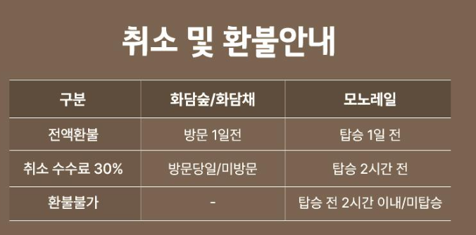 - 예약일 당일 혹은 예약일 이후 취소 시 30% 취소 수수료 적용